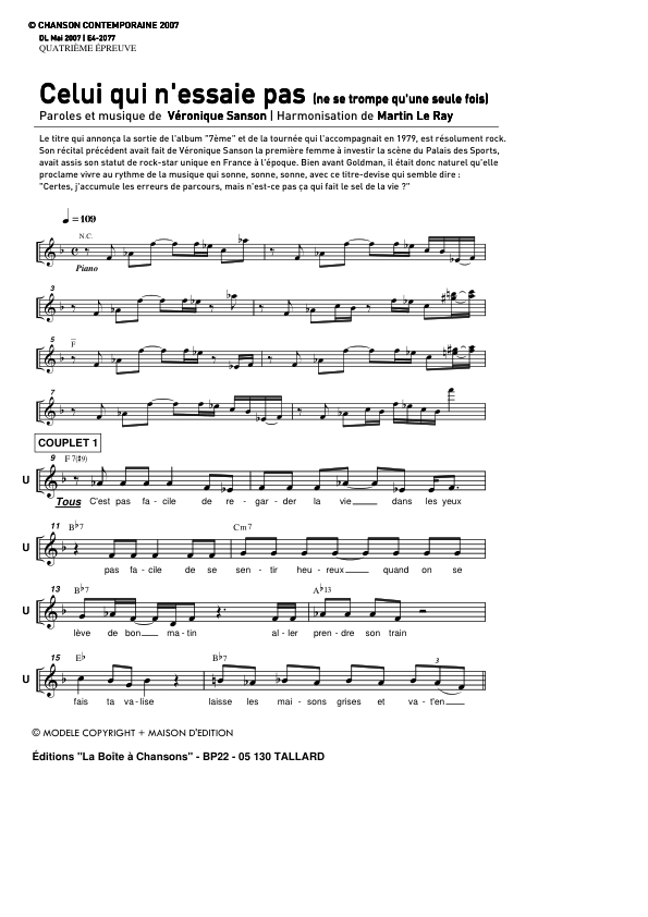 Transcription d’une harmonisation écrite pour solistes et chœur lors des Nuits de Champagne 2007. Ce morceau très rythmé, inspiré à la fois par les rythmes rock et le côté funky de la fin des années 70, demande principalement un engagement déterminé. Les trois couplets présentent une harmonisation similaire et sont assez simples à l’apprentissage. Les phrases des refrains très syncopées, et le débit rapide pour les alti exigent une bonne connaissance du texte. La structure de la fin qui répète les refrains demande un bon repérage de la partition. La coda propose un finale façon gospel très agréable à chanter, mais encore une fois très syncopé. Cet arrangement nécessite deux voix de sopranes.