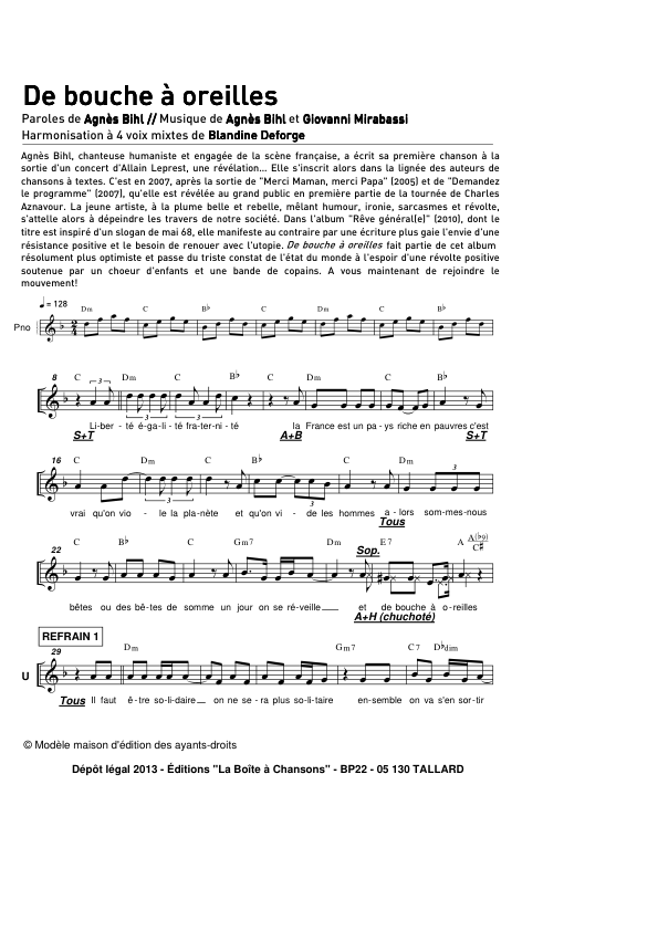 Agnès Bihl, chanteuse humaniste et engagée de la scène française, a écrit sa première chanson à la sortie d'un concert d'Allain Leprest, une révélation… Elle s'inscrit alors dans la lignée des auteurs de chansons à textes. C'est en 2007, après la sortie de "Merci Maman, merci Papa" (2005) et de "Demandez le programme" (2007), qu'elle est révélée au grand public en première partie de la tournée de Charles Aznavour. La jeune artiste, à la plume belle et rebelle, mêlant humour, ironie, sarcasmes et révolte, s'attelle alors à dépeindre les travers de notre société. Dans l'album "Rêve général(e)" (2010), dont le titre est inspiré d'un slogan de mai 68, elle manifeste au contraire par une écriture plus gaie l'envie d'une résistance positive et le besoin de renouer avec l'utopie. De bouche à oreilles fait partie de cet album résolument plus optimiste et passe du triste constat de l'état du monde à l'espoir d'une révolte positive soutenue par un choeur d'enfants et une bande de copains. A vous maintenant de rejoindre le mouvement!