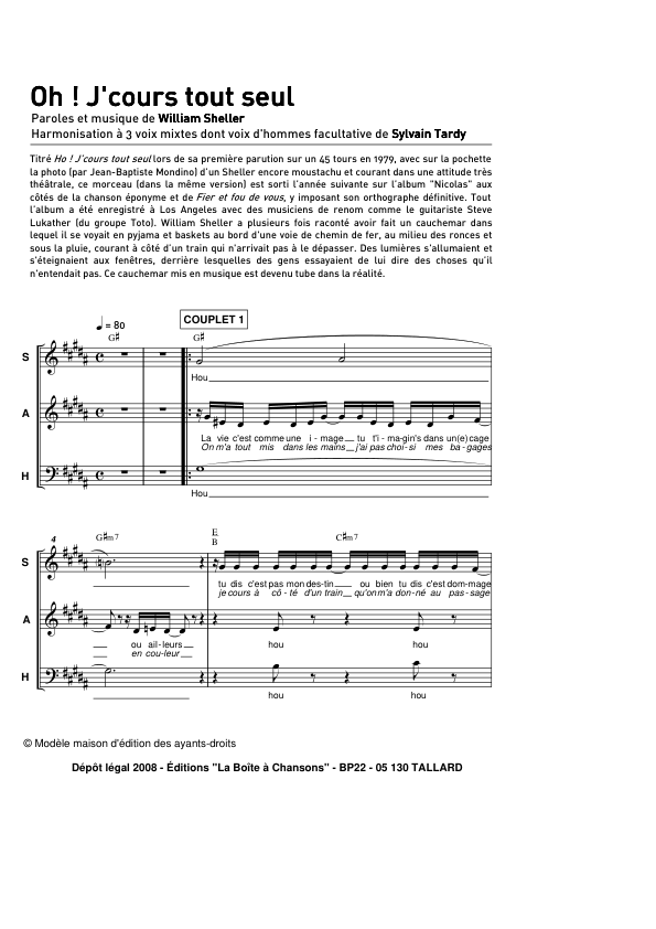 Voici une version polyphonique sans surprise du tube de Sheller : texte et mélodie originale sont portés principalement par les sopranes mais les autres pupitres sont également sollicités (la voix d’hommes étant facultative). La plus grande difficulté réside dans la réalisation du deuxième couplet, à aborder horizontalement, sans que les différentes voix ne se réfèrent les unes aux autres. L’idée ? Créer un brouhaha derrière la voix principale, sans chercher à ce que tout soit parfaitement en place : il sera vain pour le chef d’essayer de donner toutes les entrées. Éventuellement, on peut plutôt reproduire pour ce deuxième couplet l’harmonisation du premier. Pour le reste, c’est un morceau efficace et plein d’énergie à intégrer à votre répertoire !