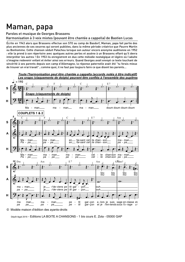 Cette chanson au swing sautillant est l’occasion d’une harmonisation verticale, entre rendez-vous homophoniques et onomatopées harmoniques, permettant une éventuelle interprétation a cappella. Quelques réponses viennent ponctuer avec évidence la mélodie répartie essentiellement entre alti et voix d’hommes. Des claquements de doigts, pensés pour être aisément intégrés à la partie des soprani mais pouvant être généralisés au tutti, impulsent une dynamique légère ainsi que des moments de break tout aussi utiles à l’énergie générale. Aux trois couplets sans refrain originaux s’ajoute ici un passage en scat sous forme de dialogue entre mamans et papas, qui vient compléter ce moment musical jazzy, frais et familial !