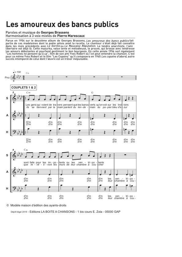 Les amoureux des bancs publics est une chanson phare du répertoire francophone. C’est que Georges Brassens savait, dès ses débuts, écrire ces refrains qui restent en tête. Le danger est de ne pas en respecter le relevé qui a été fait, car nous avons tous notre façon de nous approprier les mélodies du bon Georges. Les accompagnements marquent ici la rythmique de valse lente, avec légèreté ; là, ils teinteront de mélancolie la mélodie, qui reste ce que l’on doit entendre principalement. L’ambiance de ce classique est un joyau : le pont musical entend rendre compte de cette douce amertume, ce sourire mélancolique qu’on peut garder quand notre voix doit porter le texte.