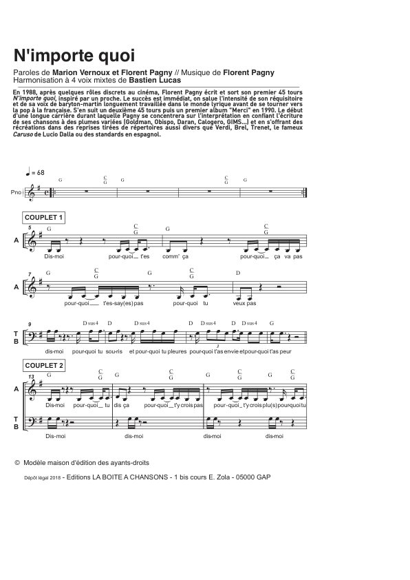 Ce tube est proposé ici dans une progression dynamique conforme à la version ‘’Vieillir ensemble – le Live’’. Pour cela, la mélodie est d’abord présentée dans le grave aux alti et hommes, puis les hommes installent quelques réponses dans les interstices et le premier refrain utilise ces trois pupitres en homophonie qui vont poursuivre ainsi au troisième couplet où les sopranes entrent avec des réponses complémentaires et un refrain augmenté par ce pupitre. Le quatrième couplet est porté par basses et voix de femmes tandis que les ténors portent un contrechant dans leurs aigus, ce qui mène à un dernier refrain homophonique au sommet de la tension. Un titre très rassembleur donc, dont l’essentielle difficulté est le débit originel du texte mais la coda met en place un canon simplissime qui pourrait être repris par le public.